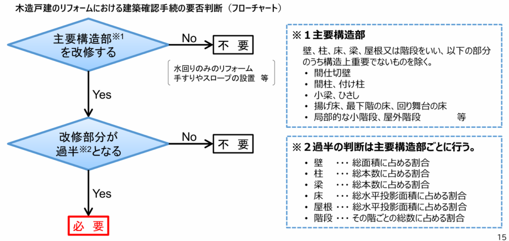 引用:国土交通省 木造戸建てのリフォームについてP.7~ 引用:国土交通省 木造戸建てのリフォームについて 国土交通省のホームページでも、木造戸建て住宅の大規模なリフォームについては、確認申請が必要となる場合がある旨が紹介されています。制度の詳細や具体的な判断基準については、国土交通省の公表資料も参考になります。