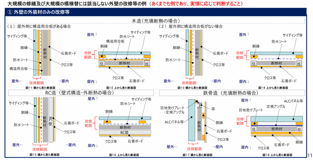 引用:国土交通省 木造戸建てのリフォームについてP.10~ 引用:国土交通省 木造戸建てのリフォームについてP.10~ こちらの資料では、断面詳細図を用いて、屋根・外壁・床・階段について、大規模修繕・大規模模様替に該当しない事例を具体的に紹介しています。工事内容の判断に迷う場面も多いため、実務上の整理を行ううえで非常に有益な資料です。参考資料として確認しておくことをおすすめします。