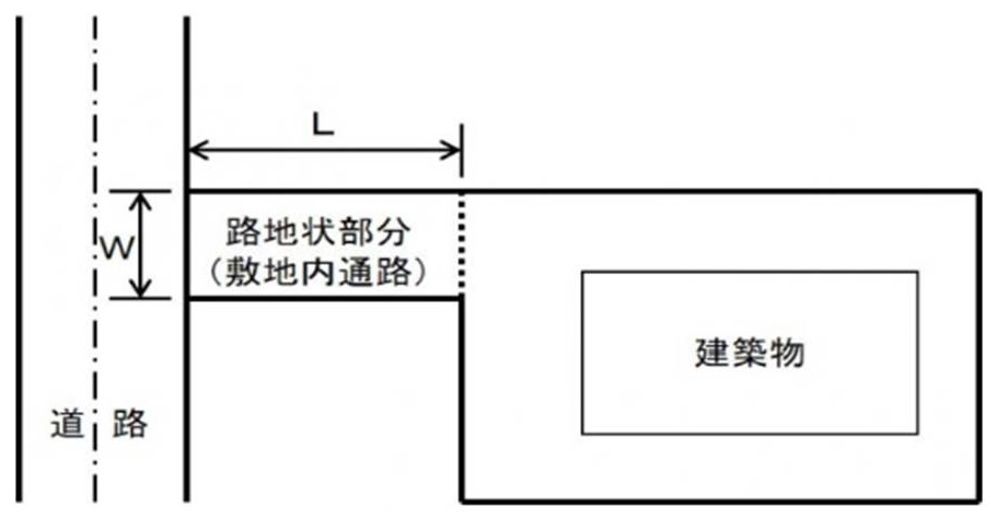 路地状敷地に該当すると、路地状部分(敷地内通路)の幅(W)と長さ(L)の制限を受ける
