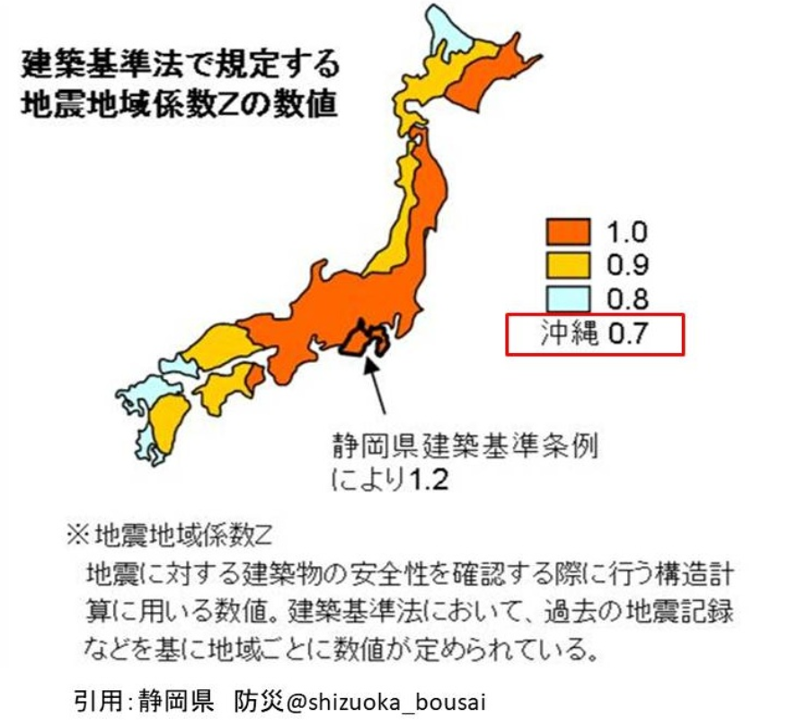 その後、1979年ごろに地震地域係数(Z値)の見直しが行われましたが、沖縄の特殊な事情にも配慮され、結果として「0.7」という数値が採用されました。東京や大阪が1.0であることを考えると、「0.7」という数値は約30%小さく、設計上の地震力が大きく軽減されることになります。
