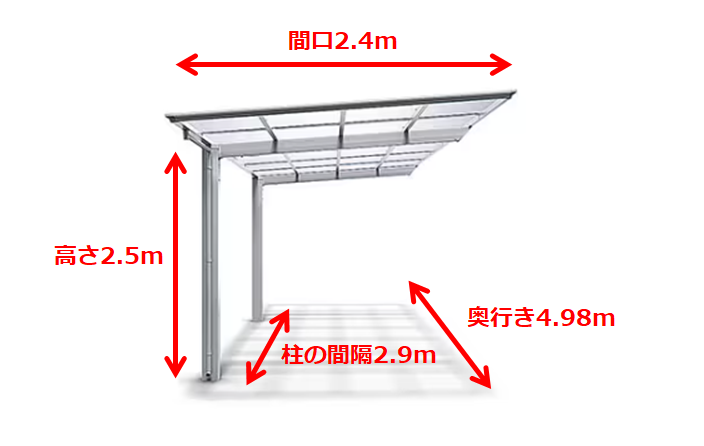 実際の商品を例に、以下の寸法のカーポートについて建築面積の算定方法を整理します。