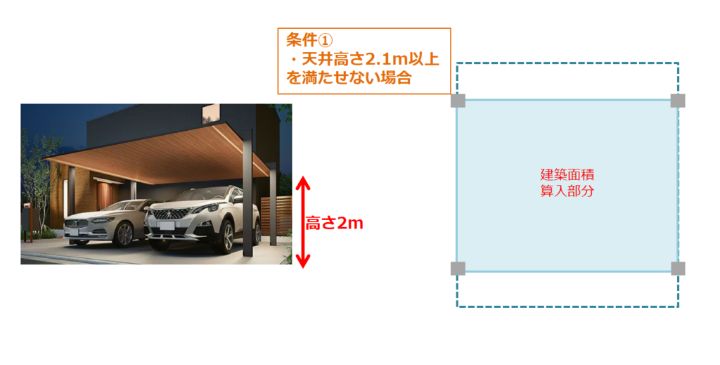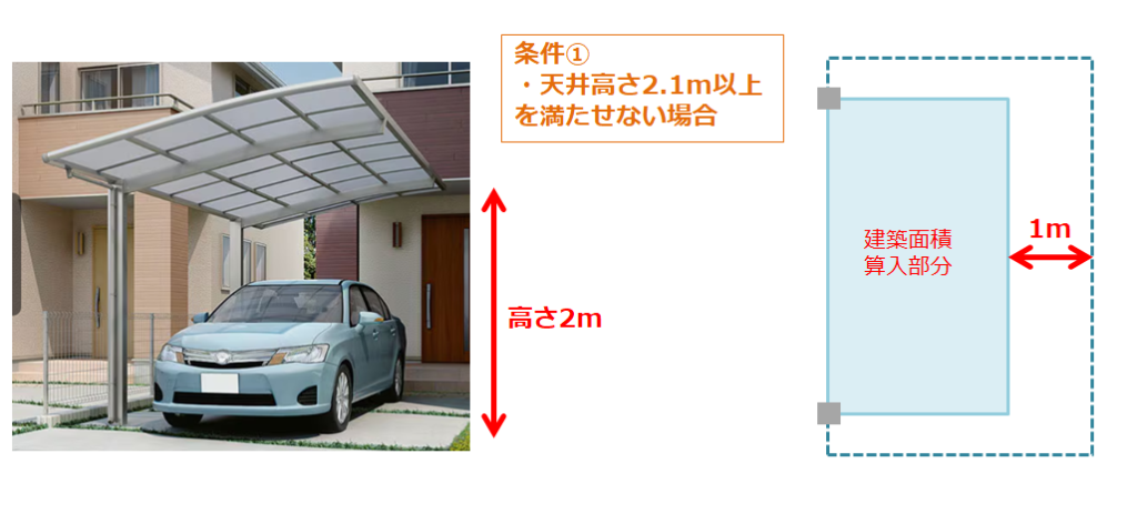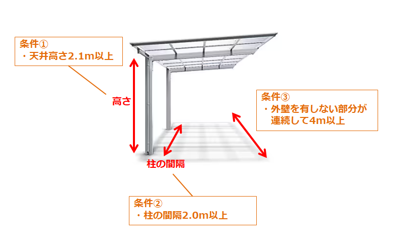 ・外壁やサイドパネルがあるカーポートは、条件③を満たせなくなります。