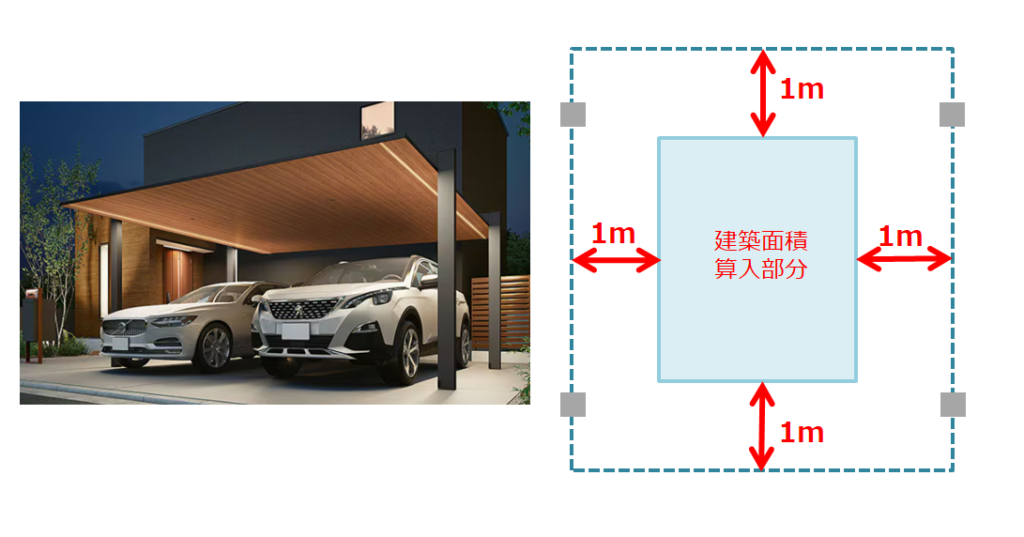 今回のカーポートは「高い開放性を有する建築物」に該当するため、建築面積を小さく算定できました。
