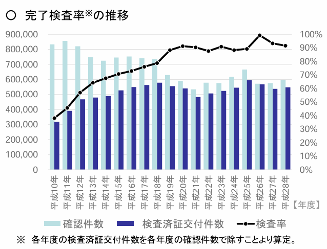 一方で、平成初期の段階では検査率が50%を大きく下回るなど、実施が十分ではない時期もあった