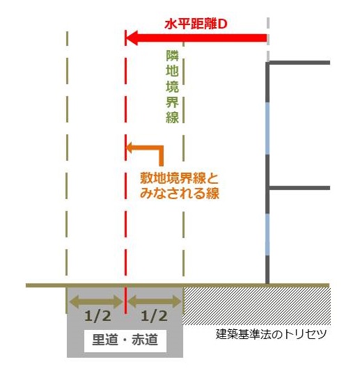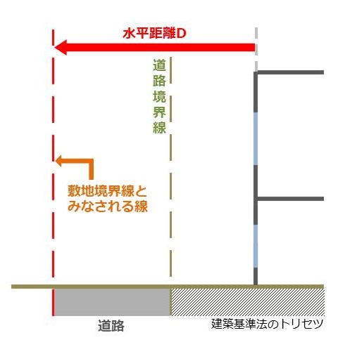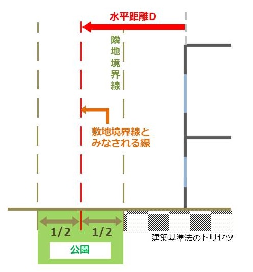 ただし、道路や公園などに面している場合、水平距離Dが緩和されます。