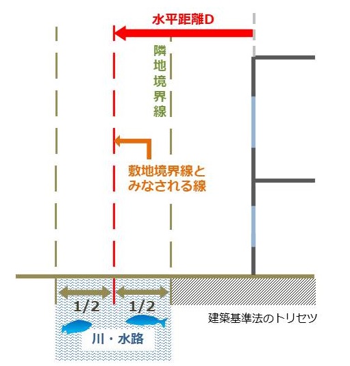 川・河川・水路・水面は、1/2だけ外側に隣地境界線があるものとして扱います