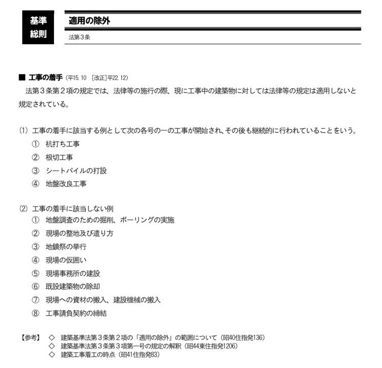 理由は、過去の通達「建築工事着工の時点(昭和41年住指発83号)」と、「建築確認のための基準総則・集団規定の適用事例」という文献を参考にしているためです。
