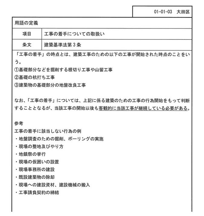 他の多くの行政庁と同様に、国土交通省の通達や書籍をもとに標準的な解釈・運用を行っています。引用:東京都大田区工事の着手についての取扱い 大田区も愛知県など他の行政庁と変わりなく、特別なローカルルールや独自運用は設けていません。