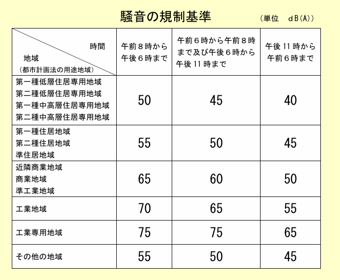 基準値は行政庁や用途地域、時間帯によって異なり、日中はおおむね55〜65dB程度が目安