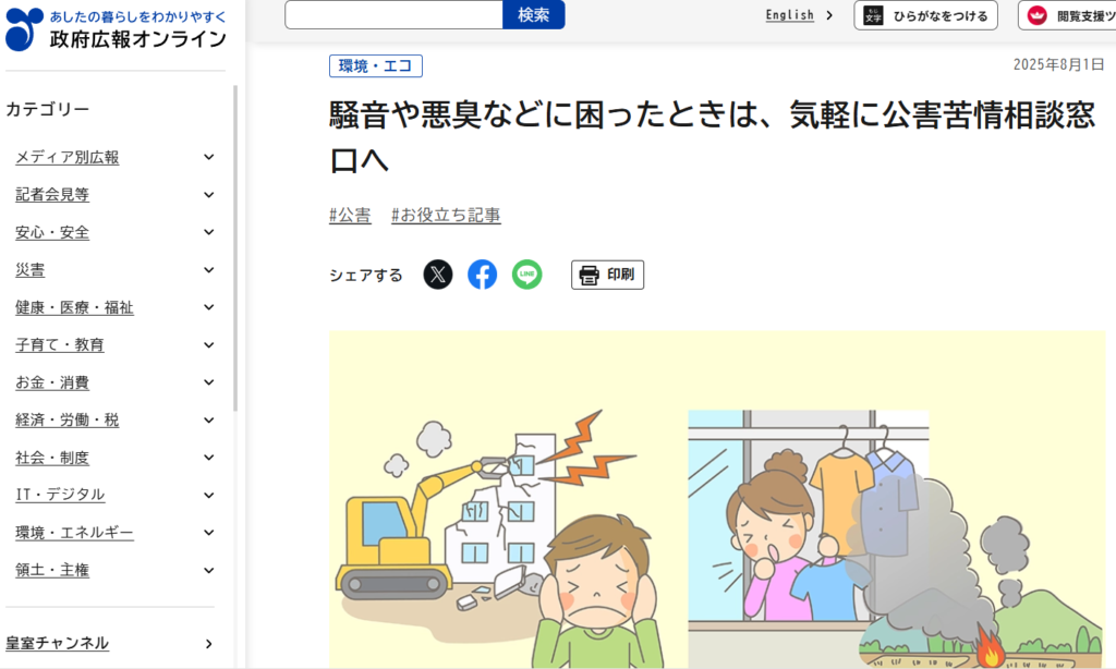 引用:騒音や悪臭などに困ったときは、気軽に公害苦情相談窓口へ | 政府広報オンライン