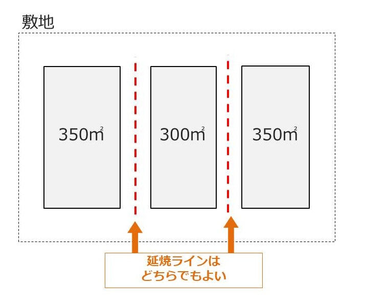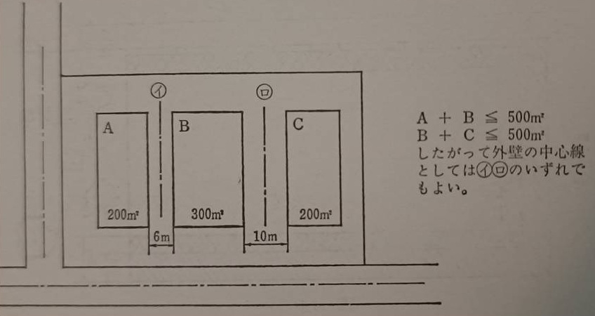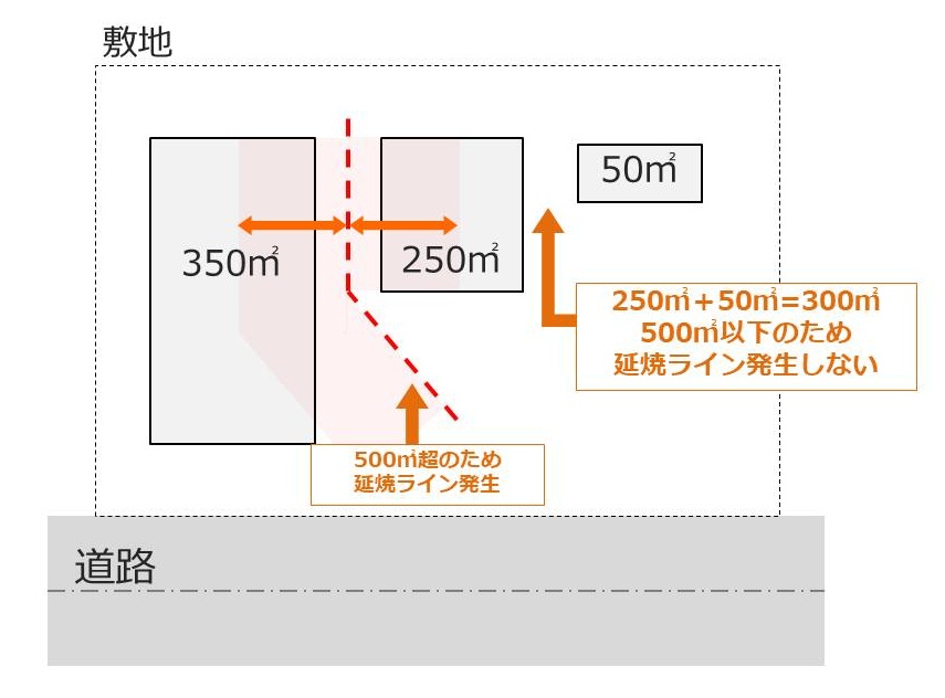 図のとおり合計で500㎡を超えなければ、延焼ラインは発生しません。