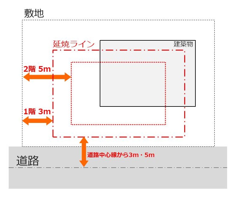 延焼ラインは、以下のいずれかの線から測って1階なら3m以内、2階以上なら5m以内の範囲が対象になります