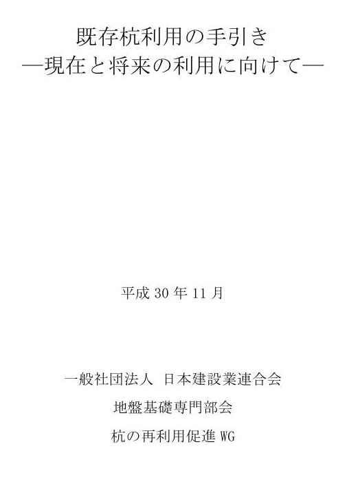 ![]() ![]() 既存杭利用の手引き -現在と将来の利用に向けて- | 作成:一般社団法人日本建設業連合会 ポイント:既存ぐいを利用する場合の検討手順や調査技術等をとりまとめた資料 |