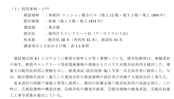 近年、建設コストの削減や工期の短縮などのメリットのほか、環境負荷への配慮等を背景として、従前の建築物に使用されていた基礎ぐいを存置させて、建て替え後の建築物の基礎ぐい等の一部として利用する取組が行われている。