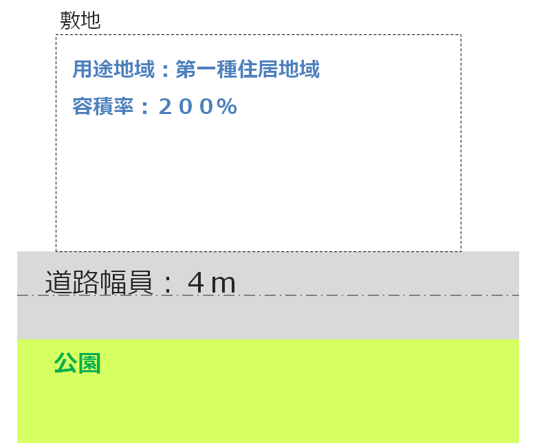 左の図では、前面道路の幅員が4mのため、容積率は4m×0.4により160%が上限となり、指定容積率200%をすべて使うことはできません。