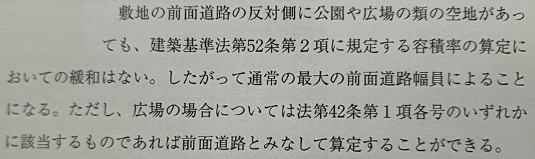 このとおり、道路の反対側に公園等があっても、容積率の算定においては緩和されない旨が示されています