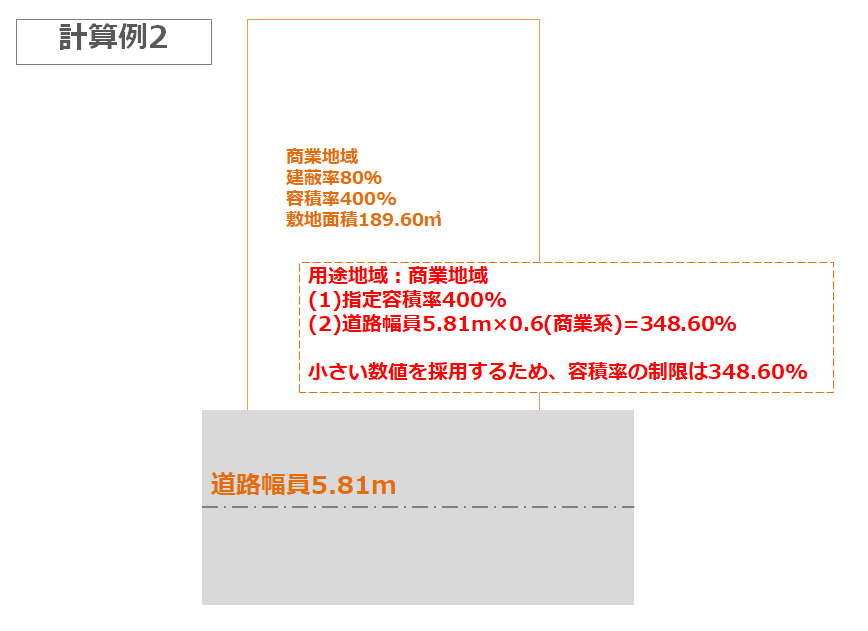 | 近隣商業 商業 準工業 工業 工業専用 | 都市計画で定める指定容積率 | 「都市計画で定める指定容積率」と「前面道路幅員×0.6」で得た容積率の小さい方の値 |