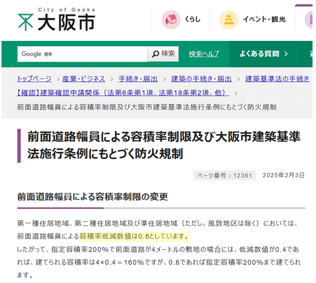 | 一低層 二低層 一中高層 二中高層 一住居 二住居 準住居 田園住居 | 都市計画で定める指定容積率 | 「都市計画で定める指定容積率」と「前面道路幅員×0.4」で得た容積率の小さい方の値 |