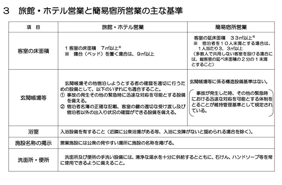 一方、旅館業法では、客室の広さ、換気、採光、洗面・入浴・便所などの施設基準が定められている