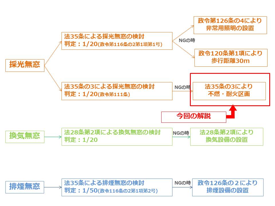 この記事では、建築基準法第35条の3に基づく「採光無窓の居室」の区画緩和について解説します。法第28条や政令第19条の絶対採光の緩和については、別記事で取り上げています。