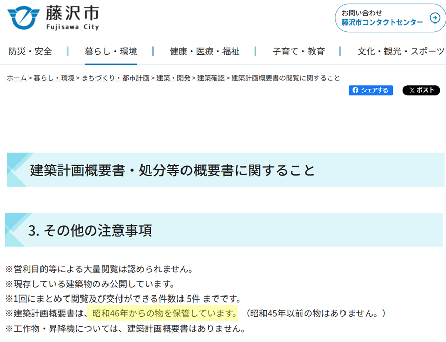 引用:藤沢市 建築計画概要書に関すること 藤沢市では、制度が始まった昭和46年から概要書を保存しているようです。同じように昭和46年から残している行政庁は、実は少なくありません。