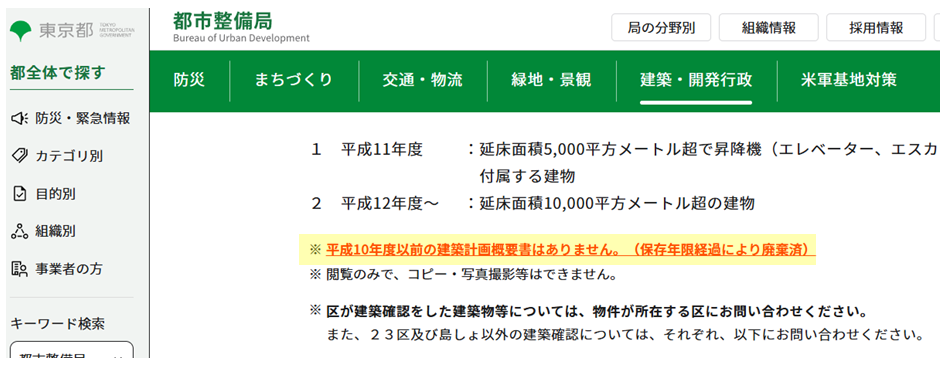引用:東京都都市整備局 建築物を安全に建てるために 東京都では平成10年以前の概要書はすでに廃棄済みです。現在残っているのは、法で保存が義務付けられたものなようです。