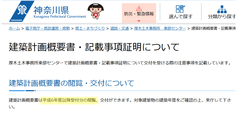 引用:神奈川県 建築計画概要書について 神奈川県では「平成6年度以降は残っている」との記載があります。少し中途半端な印象ですが、当時は5年保存だったものが、法改正により保存期間が延長された結果と考えられます。
