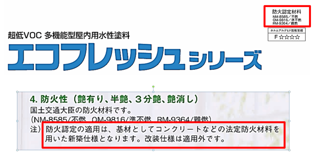 例えば、下地が木材であれば、塗料が不燃表示であっても、全体として不燃とは扱われない