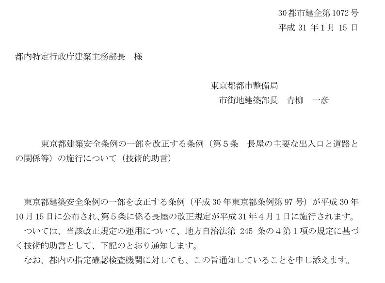 (第5条 長屋の主要な出入口と道路との関係等)の施行について(技術的助言)本記事で紹介した技術的助言には、条例の解釈や趣旨が記載されており参考になります。設計前に一度目を通しておくことをおすすめします。