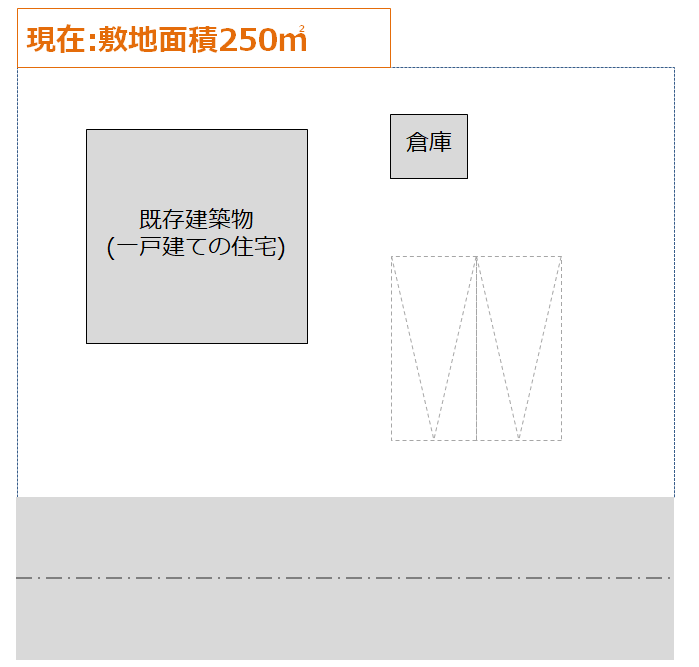敷地が広いため、既存の倉庫と駐車場を撤去し、敷地を分割して余った土地に新たに一戸建て住宅を建てる計画です。一戸建て住宅は可分のため別棟増築はできず、敷地を分割したうえで新築として確認申請を出す必要があります。