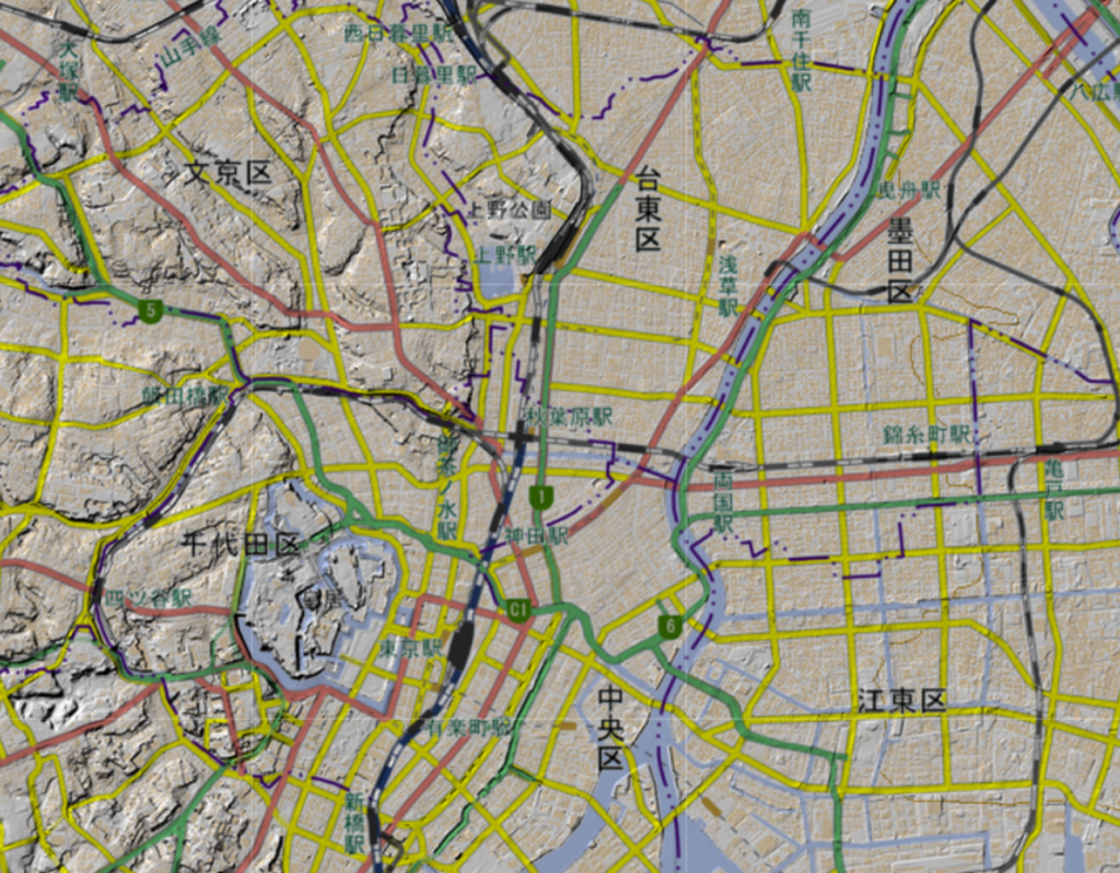 クリックで拡大 こちらは山手線の内側にある千代田区と、スカイツリーのある墨田区周辺の陰影起伏図です。千代田区を見ると、高低差がある地形であることが分かります。一方で、墨田区周辺はほとんど陰影が見えません。これは地形が非常に平坦で、高低差がほとんどないことを示しています。実際、この地域は荒川や隅田川によって形成された低地で、広い範囲がほぼ同じ高さの土地になっています。同じ東京都内でも、地形の違いによって高低差の状況が大きく異なることが分かります。