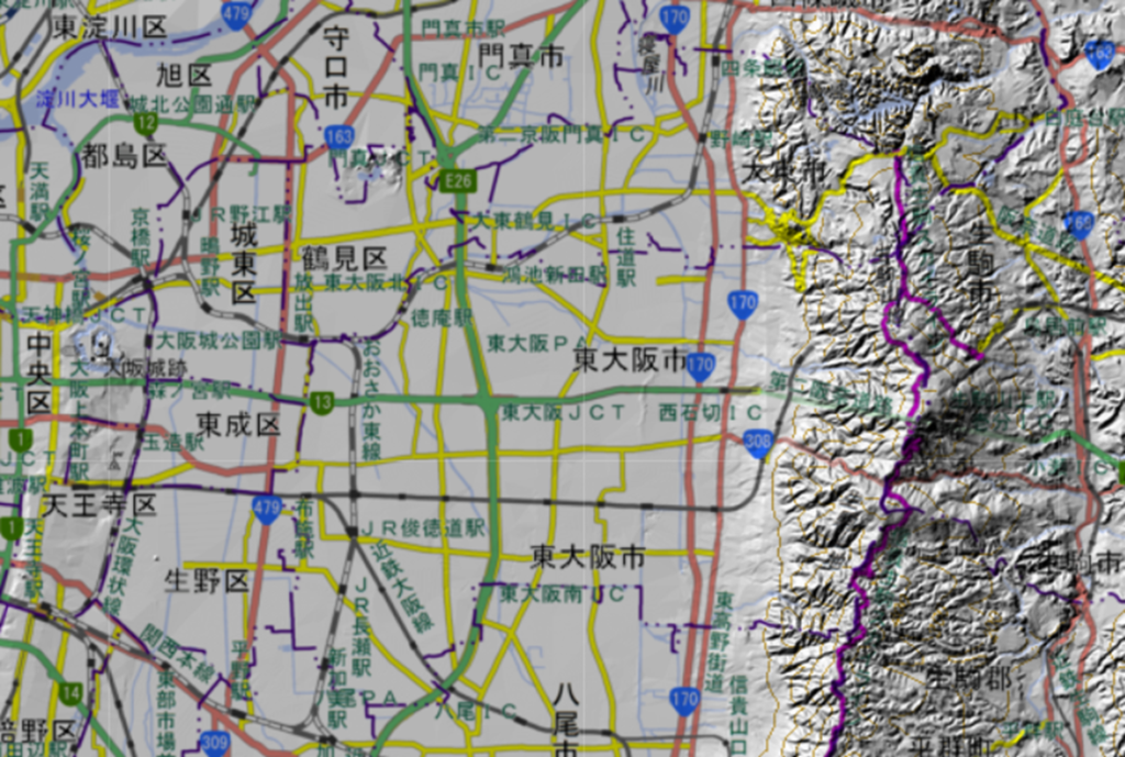 こちらは大阪市と奈良県生駒市の陰影起伏図です。