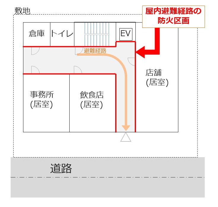 この区画は、避難階の直通階段から建物の出口までを防火区画で囲うもの