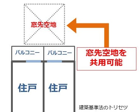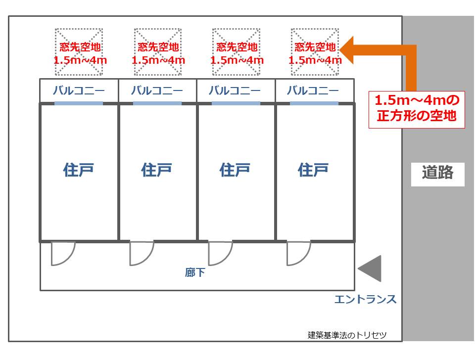 住戸の窓の正面には「窓先空地」か「道路」が必要です。