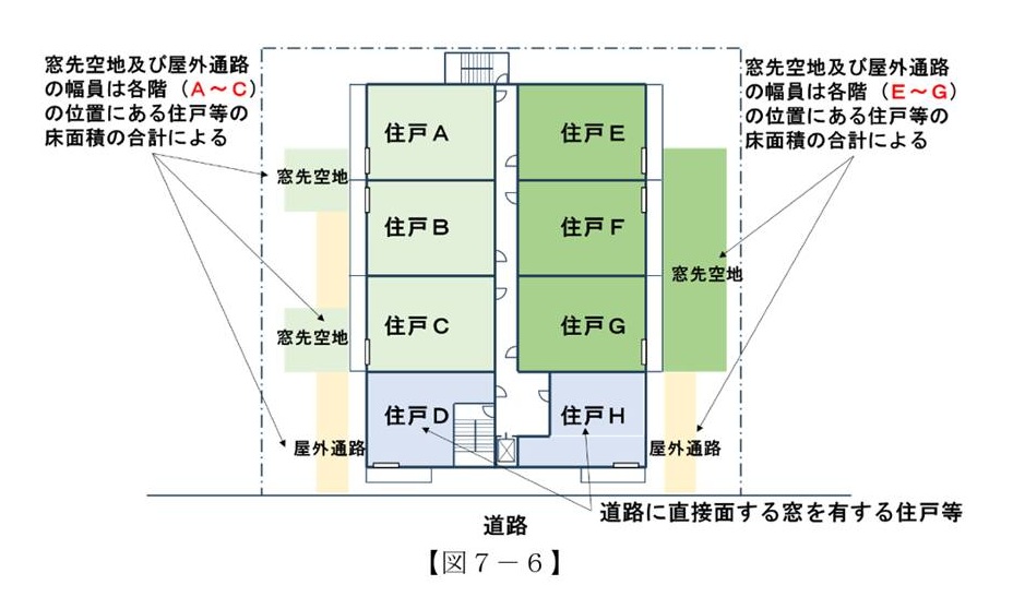 これまでは、住戸A~CとE~Gの6住戸の面積で窓先空地の幅を算定していました。