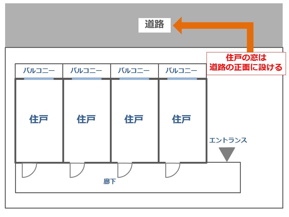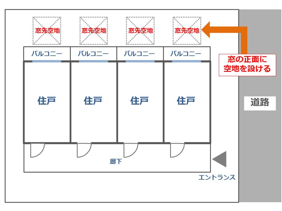 住戸の窓の正面には「窓先空地」か「道路」が必要です。