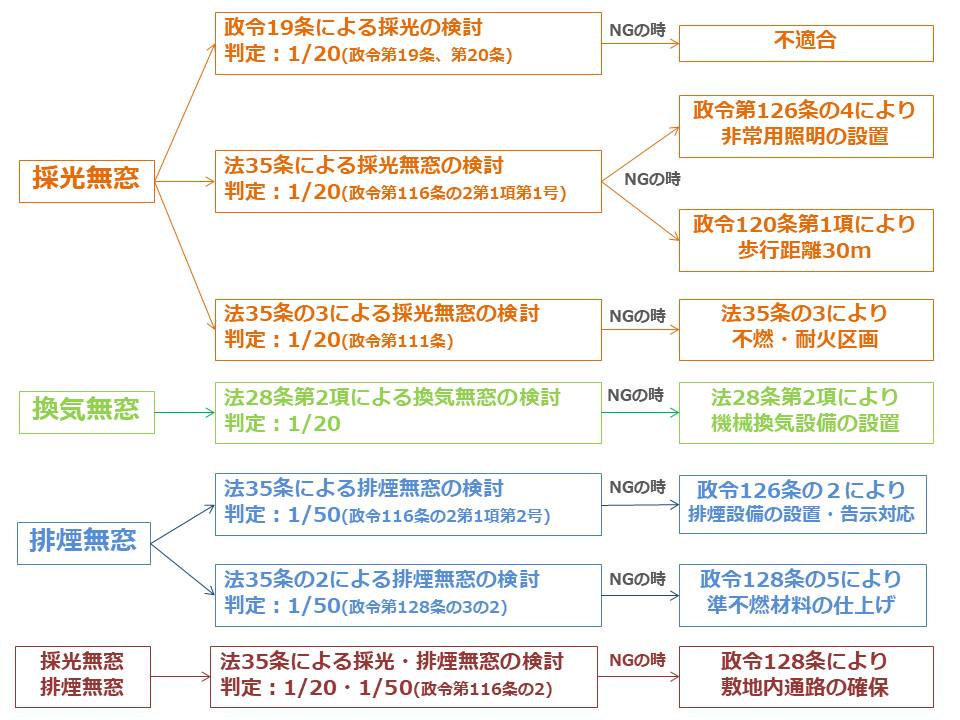 条文ごとに「採光無窓」「換気無窓」「排煙無窓」などがあり、必要な設備や構造対策が変わる。